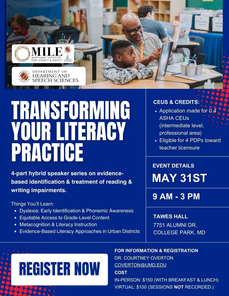 The Maryland Initiative for Literacy & Equity (MILE) and the University of Maryland’s Department of Hearing and Speech Sciences are hosting a professional development series for educators on May 31, titled Transforming Your Literacy Practice. This 4-part hybrid speaker series will focus on evidence-based strategies for identifying and treating reading and writing impairments.